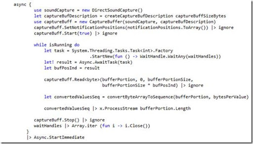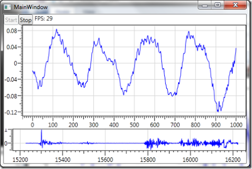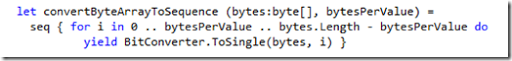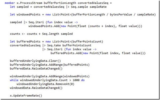 The nastiest bit of the code in ProcessStream is probably towards the end, where the windowedUnderlyingData is manipulated to ensure that the window only contains 1000 samples. It would be nice to do this in a non-imperative way, using Seq.windowed, but the problem is, is that the sequence we’re operating on is only the result of one buffer read operation, whereas windows etc. should operate over the whole data stream, and the sequences can’t be combined into a single sequence using yield! as they’re all generated asynchronously. Similarly, the buffer takes non-overlapping windows over the input sequence, and without taking a buffer over the whole stream, it may miss samples off the end of the sequence portions. Tomas Petricek has written a library, AsyncSeq, http://tomasp.net/blog/async-sequences.aspx which I may investigate in a later post.
